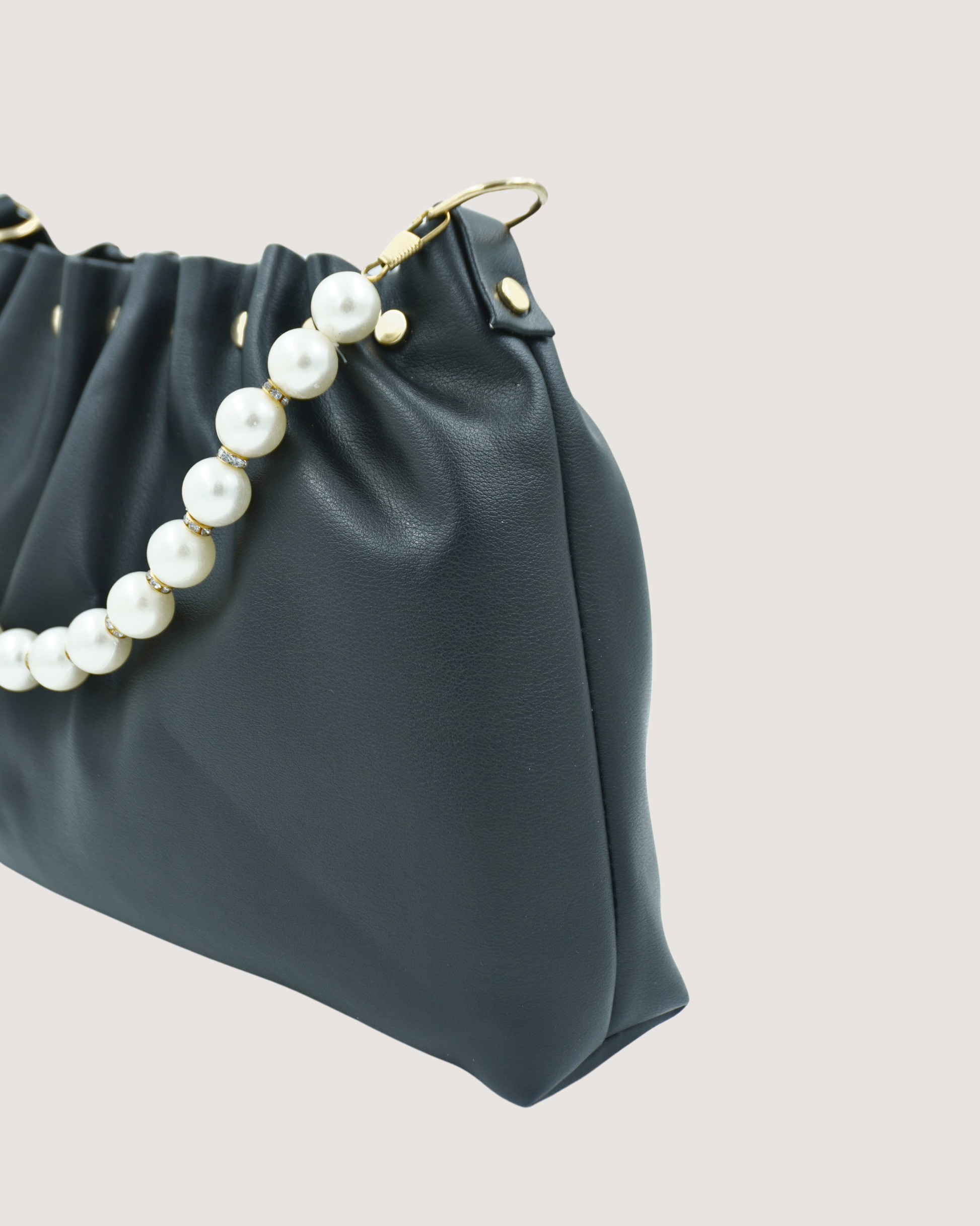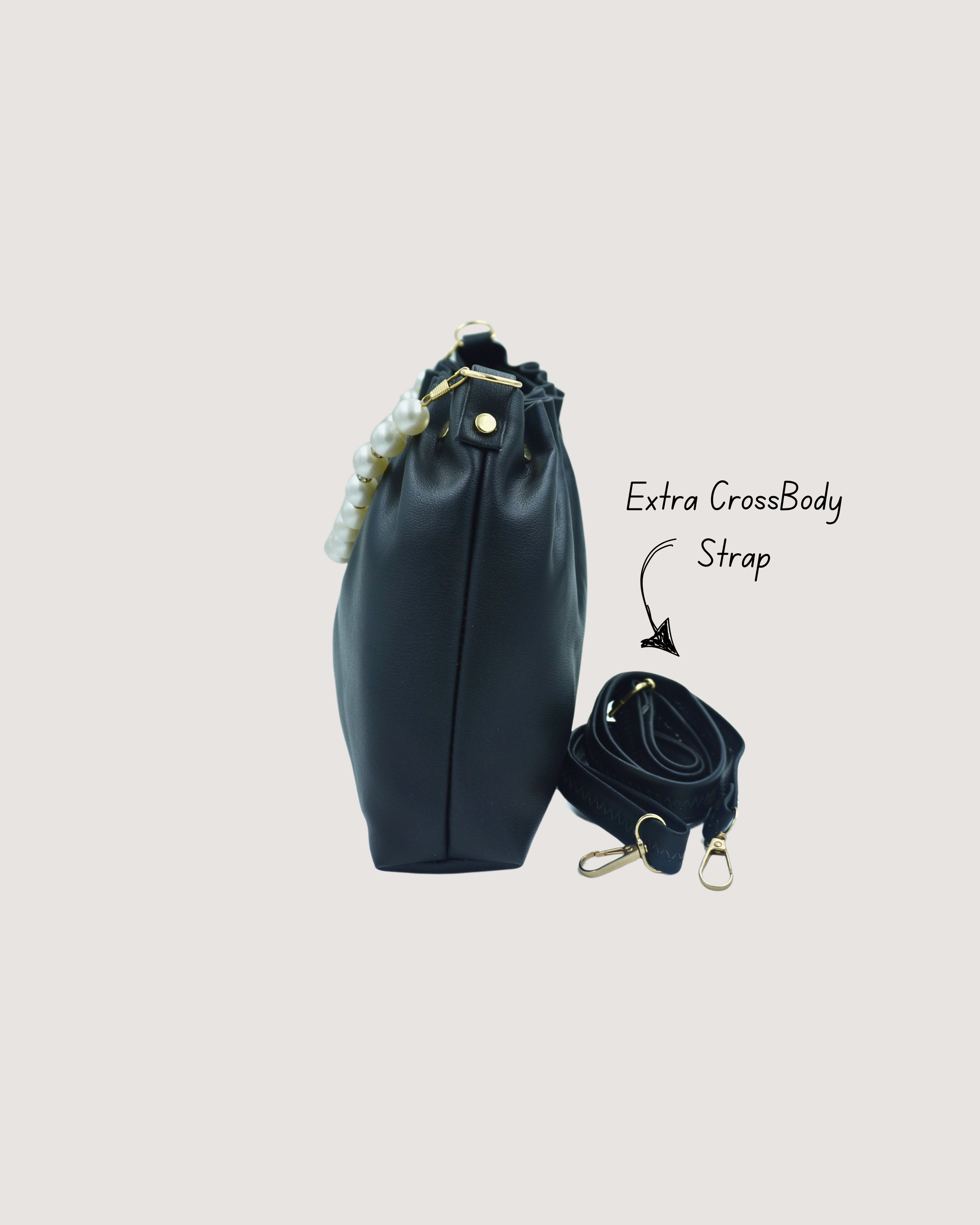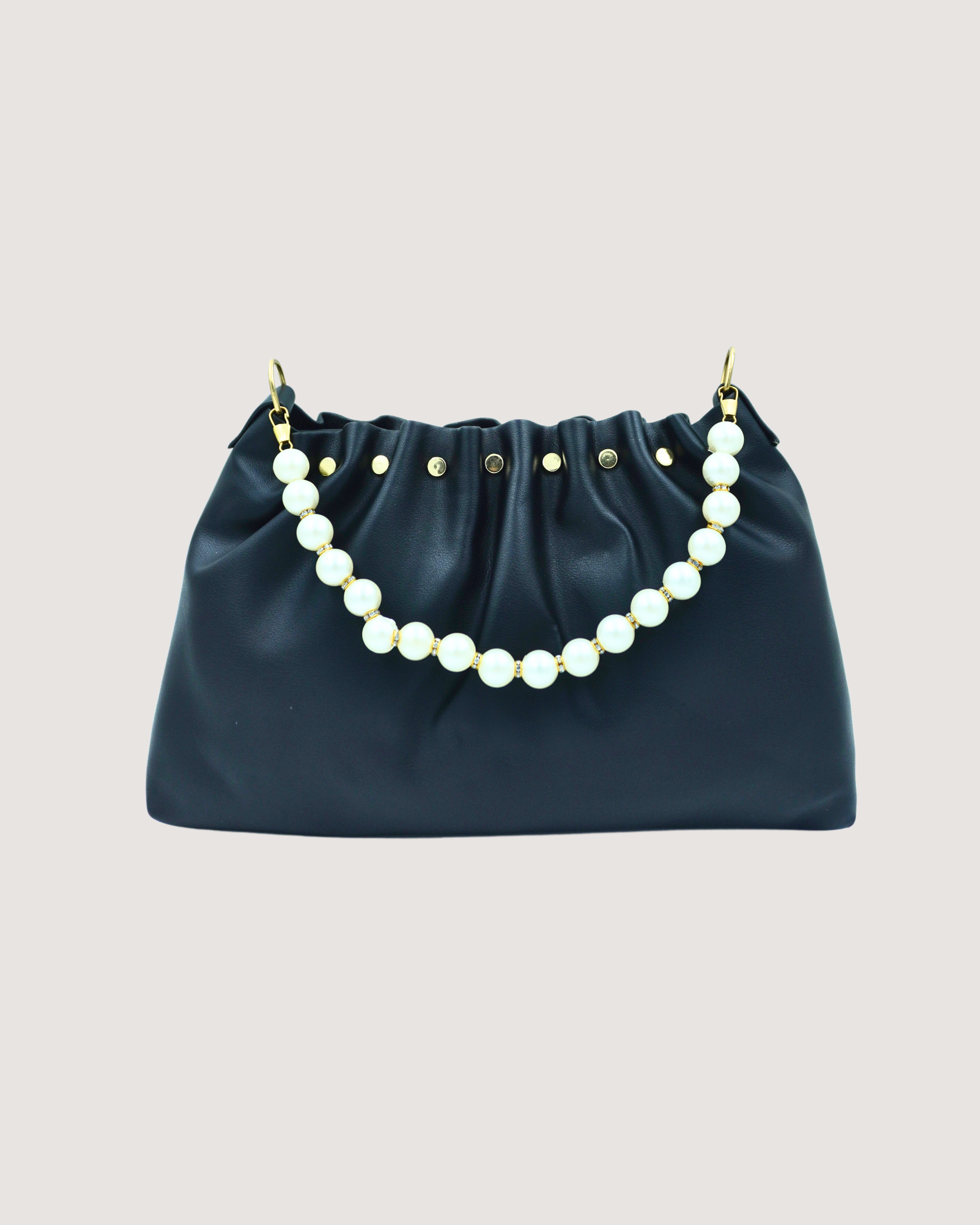 The Black Ruched leather design lends a touch of opulence, while the lustrous pearl embellishments elevate its allure. Designed for the discerning individual, this bag seamlessly blends classic charm with contemporary flair.