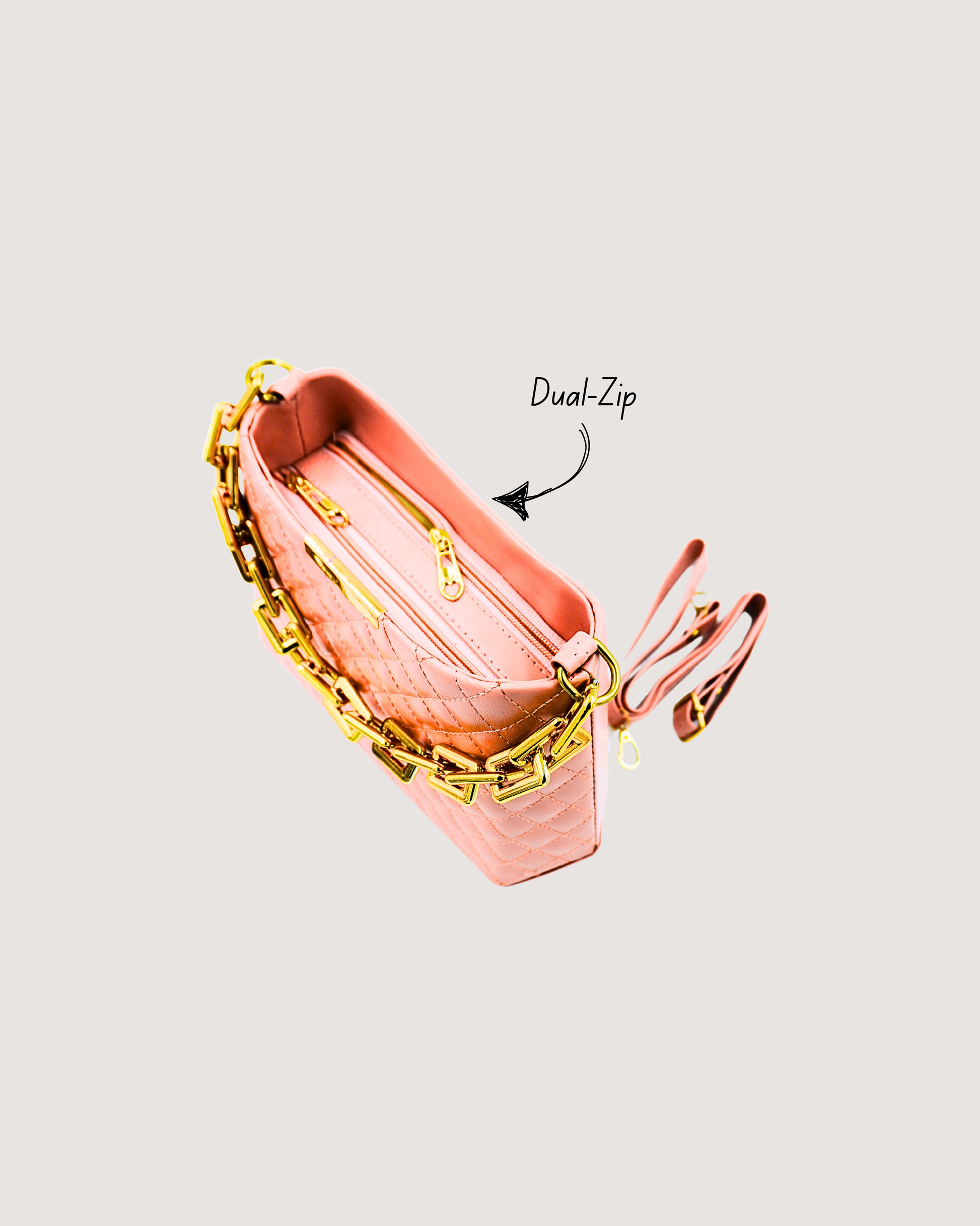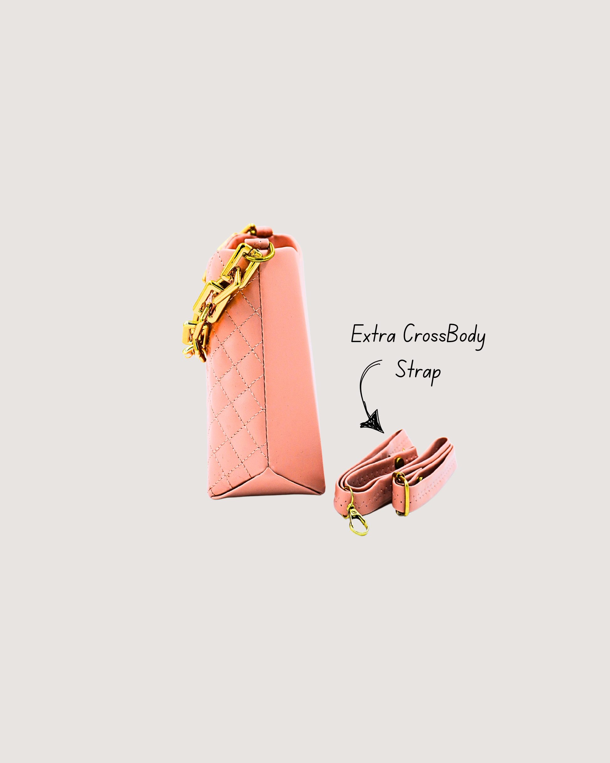 Featuring a dual-zip closure with a cross body strap to keep all your essentials safe, it also promises an easy carry. Showcasing a quilted pattern, this Peach-Sling exudes a flair of sophistication. To ensure longevity, this sling is made of Vegan-leather.