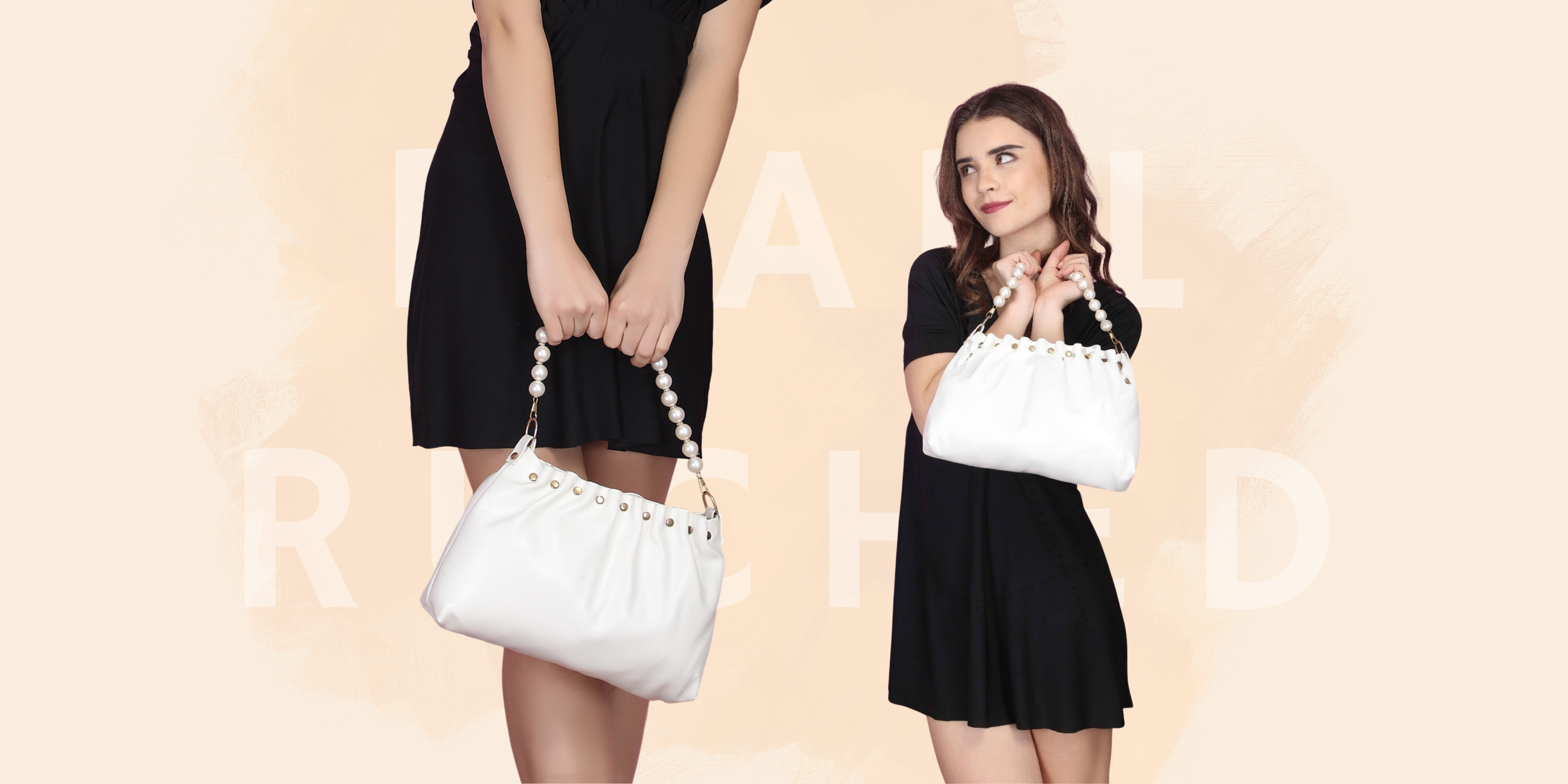 Experience the epitome of elegance with the Pearl Ruched Handbag from Illuminate. Crafted for the discerning woman, this luxurious vegan leather accessory exudes sophistication and grace, making it an indispensable addition to any refined wardrobe.
